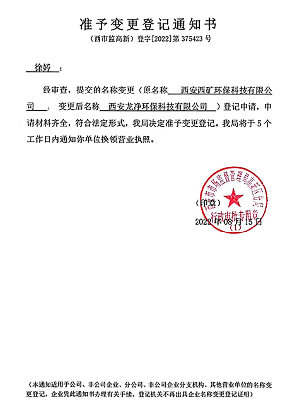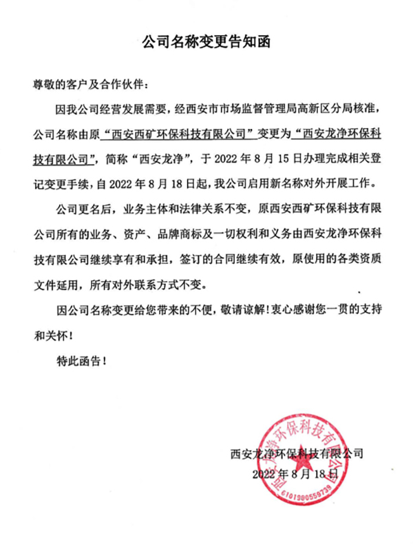 因我公司經營發(fā)展需要,經西安市市場監(jiān)督管理局高新區(qū)分局核準,公司名稱由原“西安西礦環(huán)保科技有限公司”變更為“西安龍凈環(huán)保科技有限公司”,簡稱“西安龍凈”,于2022年8月15日辦理完成相關登記變更手續(xù),自2022年8月18日起,公司啟用新名稱對外開展工作。